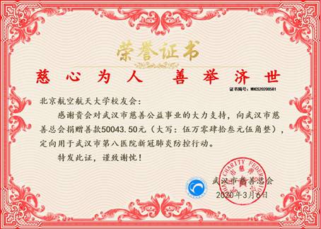 截止3月4日零时,bevictor伟德湖北校友会共接收到了来自校友和各界爱心人士的捐款人民币417700.16元,累计支出人民币317656.66元。接收捐赠口罩2000个,防护面具8100个。捐赠物资由北航湖北校友会接收后,已全部移交给定向受赠人和市疫情防控指挥部根据实际情况统一调配。