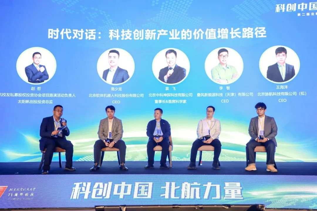 星光演讲聚焦科技的未来与创新,演讲嘉宾们分享了他们在实践中的成功案例和创新成果,呈现了不畏失败、积极向上的北航创新精神。接下来的时代对话环节由北航校友私募股权投资协会项目路演活动负责人、太阳帆创投投资总监赵哲担任主持。来自不同领域的专家学者和业界精英,共同探讨科技创新产业的价值增长路径。
