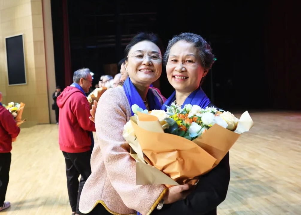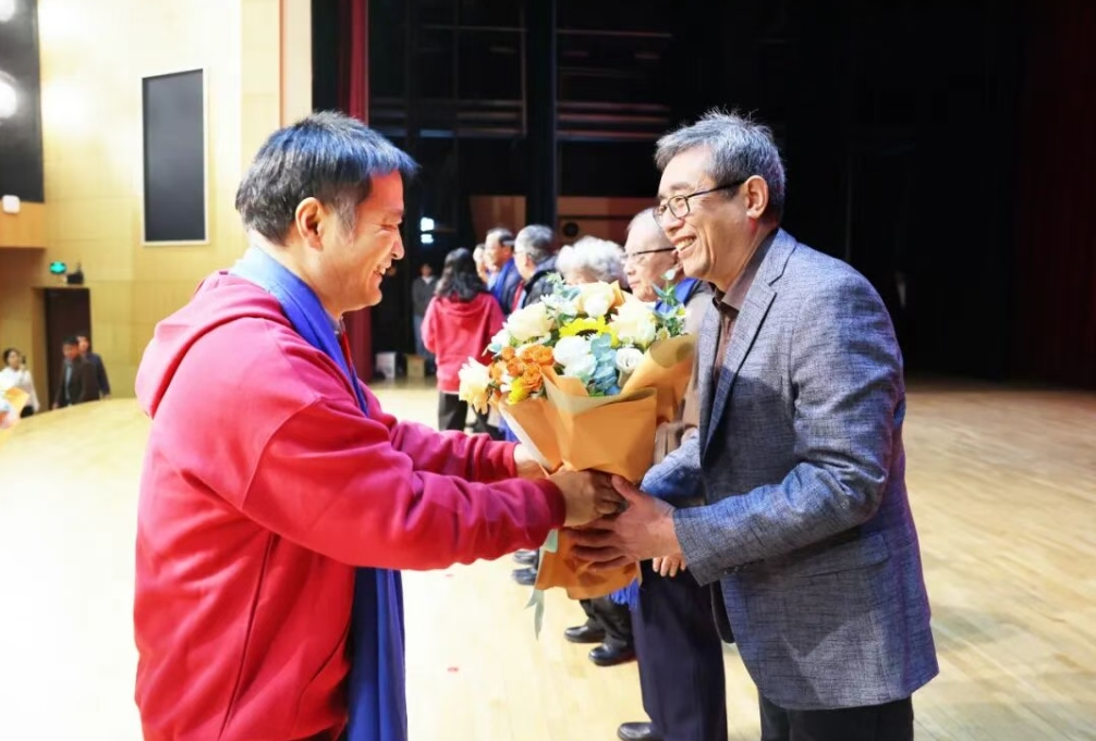大会上,1995届校友代表向老师献花,表达对母校、老师培育之恩的深深敬意和浓浓感激之情。