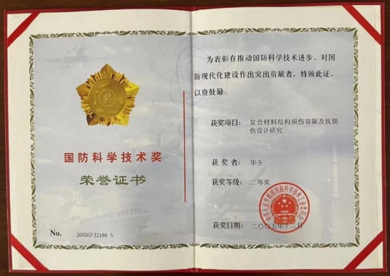 2005年,郦老师告诉我一个好消息,北航“复合材料结构损伤容限及抗损伤设计研究”项目组 (包括我在内)历经十多年持续研究的系列成果已获2005年度国防科技进步二等奖。很快,我收到了珍贵的获奖证书。